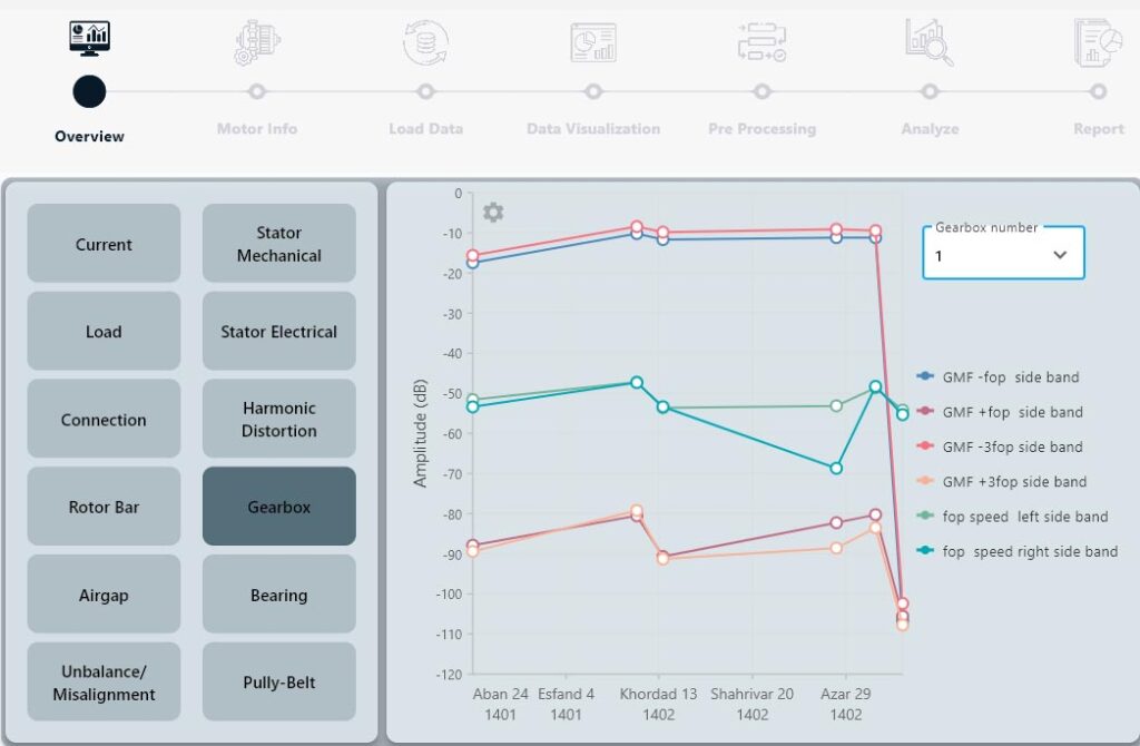این صفحه بخش «تشخیص عیوب گیربکس با استفاده از هوش مصنوعی» را نمایش میدهد. در سمت چپ، فهرستی از اجزای کلیدی موتور و سیستم (از قبیل جریان، بار، استاتور، یاتاقان و غیره) وجود دارد که کاربر میتواند آنها را برای بررسی انتخاب کند. با انتخاب گزینه گیربکس، نمودار سمت راست تغییرات شاخصهای فرکانسی و باندهای جانبی مرتبط با دندهها را در بازههای زمانی مختلف نمایش میدهد. این دادهها با کمک الگوریتمهای هوش مصنوعی تحلیل شده و تغییرات غیرعادی که میتوانند نشانه اولیه خرابی یا سایش باشند، بهصورت بصری و واضح نشان داده میشوند، تا تیم نگهداری بتواند قبل از وقوع خرابی جدی، اقدامات لازم را انجام دهد.