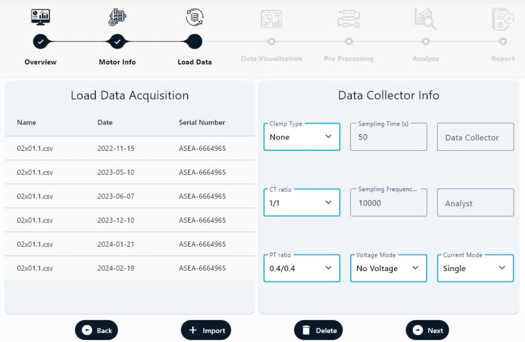 در این بخش نرمافزار، قابلیت دادهبرداری آنلاین از موتورها نمایش داده میشود. جدول سمت چپ، لیست فایلهای داده ثبتشده را با تاریخ، نام فایل و شماره سریال موتور نشان میدهد تا کاربر بتواند بهراحتی سوابق را مرور یا مقایسه کند. در سمت راست نیز تنظیمات جمعآوری داده (Data Collector) قرار دارد که شامل نوع کلمپ، زمان نمونهبرداری، فرکانس نمونهبرداری، نسبت ترانس جریان (CT ratio)، نسبت ترانس ولتاژ (PT ratio)، حالت ولتاژ و حالت جریان است. این ویژگی امکان پایش لحظهای عملکرد موتور و ذخیره دادهها با جزئیات دقیق را فراهم کرده و به تیم فنی کمک میکند تا هرگونه تغییر یا نشانه خرابی را در همان لحظه شناسایی و مدیریت کنند.