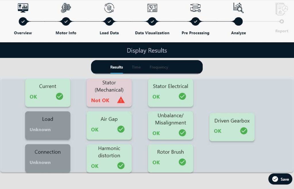 این بخش از نرمافزار مربوط به **ترسیم و نمایش وضعیت شاخصهای خرابی** است که نتیجه تحلیل دادههای موتور را بهصورت یک نمای کلی ارائه میدهد. هر بخش کلیدی موتور از جریان و استاتور تا گیربکس و بالانس مکانیکی با برچسب رنگی و وضعیت مشخص (OK یا Not OK) نمایش داده شده است. این طراحی باعث میشود کاربر در یک نگاه متوجه نقاط سالم و بخشهای مشکلدار شود. برای مثال، در این تصویر وضعیت مکانیکی استاتور با هشدار قرمز مشخص شده، در حالی که سایر شاخصها سبز و سالم هستند. این رویکرد ترندی به نگهداشت پیشبین کمک میکند تا روند تغییرات و ظهور مشکلات بهطور مداوم تحت نظر باشد.