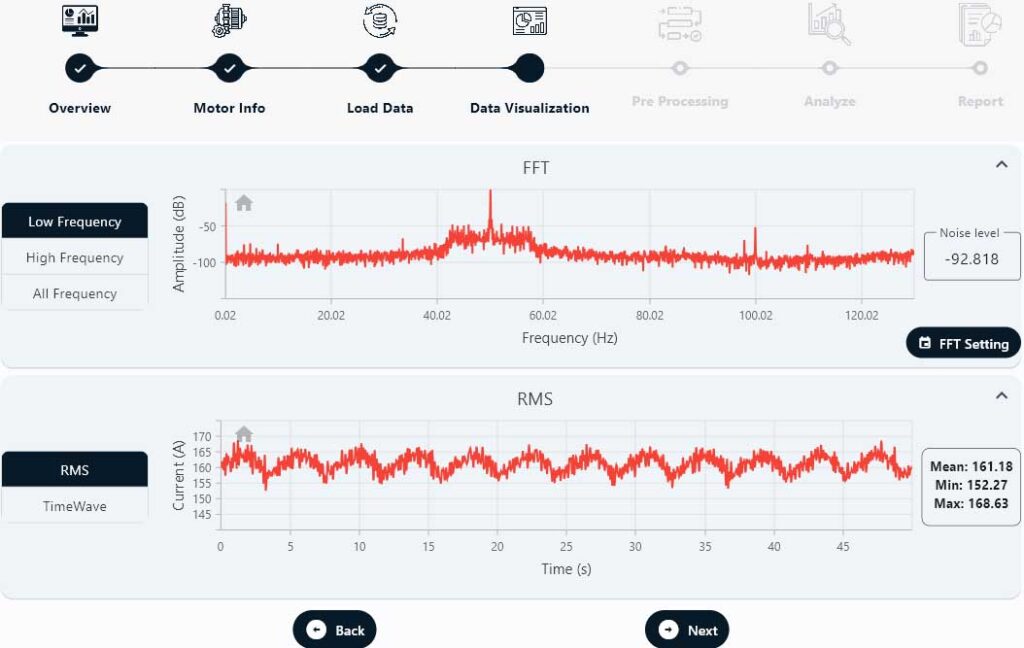 در این بخش نرمافزار، قابلیت استخراج طیف فرکانسی جریان با رزولوشن بالا به نمایش گذاشته شده است. نمودار بالا (FFT) توزیع دامنه سیگنال جریان را بر اساس فرکانس نشان میدهد و امکان شناسایی پیکهای غیرعادی را فراهم میکند که میتوانند نشانه وجود ایرادات مکانیکی یا الکتریکی باشند. همچنین نمودار پایین (RMS) تغییرات میانگین توان جریان موتور را در طول زمان ثبت میکند و مقادیر حداقل، حداکثر و میانگین را در کنار دادهها نمایش میدهد. این ترکیب باعث میشود کاربر بتواند هم رفتار فوری موتور و هم روند تغییرات آن را رصد کرده و در صورت مشاهده الگوهای مشکوک، اقدامات پیشگیرانه انجام دهد.